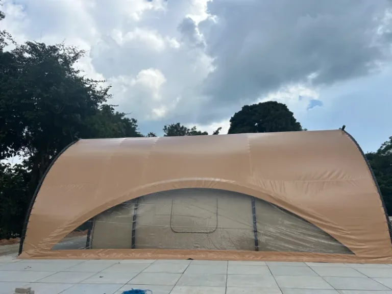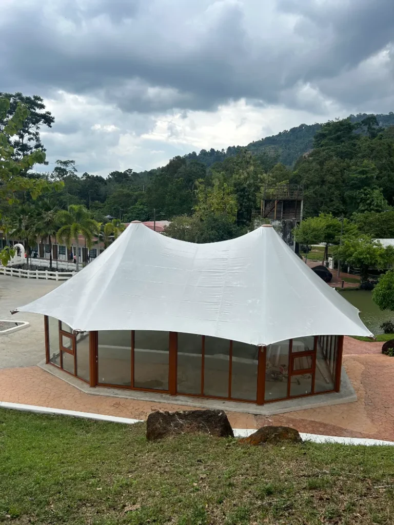 The main fame structure of the resort tent is galvanized steel pipe, which is solid and strong. The roof cover material is tough PVC or PVDF fabric, which is waterproof and fire-retardant.