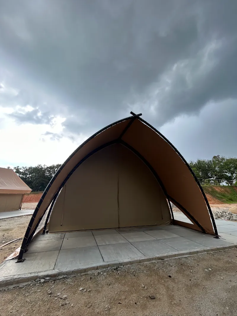 The main fame structure of the resort tent is galvanized steel pipe, which is solid and strong. The roof cover material is tough PVC or PVDF fabric, which is waterproof and fire-retardant.