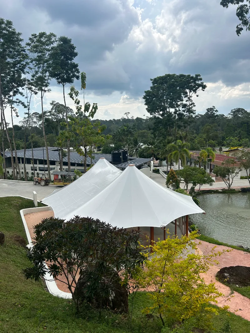 The luxury tent resort project undertaken by Yuntu Tent in Malaysia is located in the suburb surrounded by green trees.